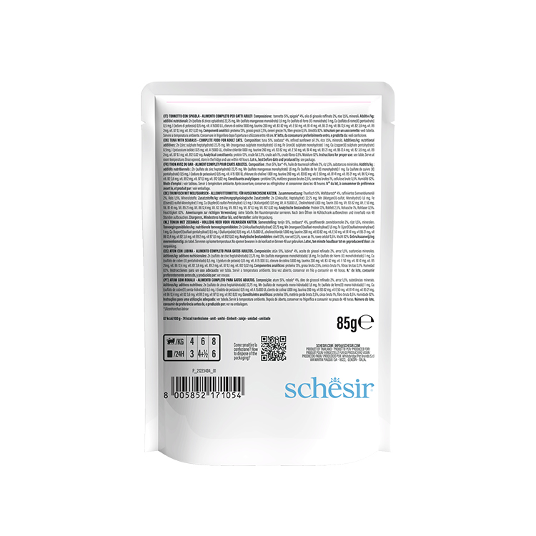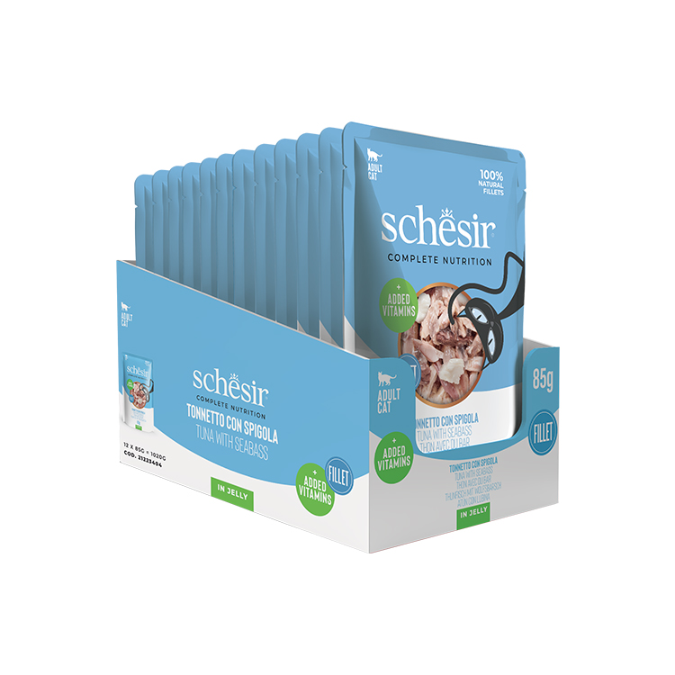Schesir, diğer tam mamalardan farklı olarak buharda pişirilmiş ve özenle seçilmiş ton balığı filetolarından oluşan, jöle veya et suyu bazlı gerçek öğünler sunar.