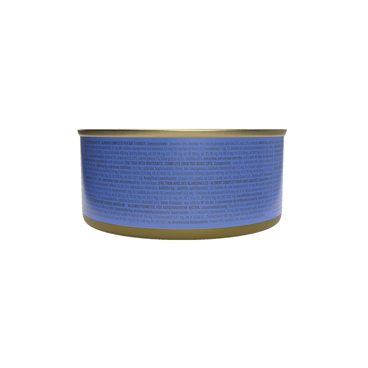 İÇİNDEKİLER: ton balığı %51, beyaz balık %4, rafine ayçiçek yağı %2, pirinç %1,5, mineraller. ANALİTİK BİLEŞENLER: protein %13, ham yağ %2,5, ham kül %1, ham selüloz %0,5. Nem %82. KULLANIM TALİMATI: 4 kg = günde 3½ konserve